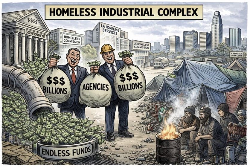 Los Angeles is described as having developed systems that financially benefit from the ongoing homelessness crisis rather than solving it, with various agencies, contractors, and nonprofits receiving large sums for managing services without reducing the number of people living on the streets.